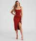 This effortless sleek asymmetric midi dress was made for grabbing drinks with your friends! It features a sleeveless cowl neckline. spaghetti straps that lead to a cross-back strap design. a wrap-front skirt with pleated detailing and an asymmetric hem. and a midi-length. curve-hugging silhouette. The smooth knit fabric offers plenty of stretch. Style with strappy stilettos.