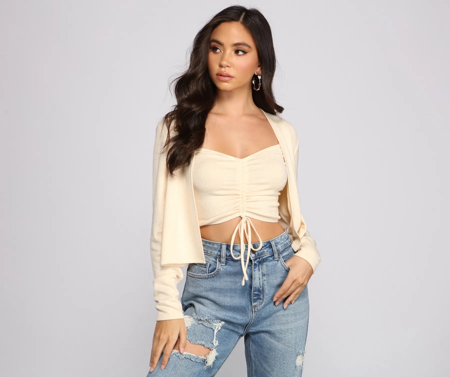 Effortlessly elevate your basic look with this lightweight knit cardigan. It features long fitted sleeves. an open front. and a relaxed fit. Pair this cardigan with the matching crop top and mom jeans for a chic vibe.