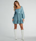 You'll look effortlessly stylish this season in this lightweight and flowy linen dress! Designed with a breezy woven fabric. this short dress is perfect for your summer parties. The bodice is shaped with a square neckline with ruching at the bust and long balloon sleeves. The fitted waistband creates a cinched silhouette. flowing out to a short ruffled hem with an A-line fit for a pretty flair. Complete the look with clear heels.