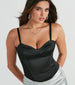 An elegant night starts with this satin bustier for a stunning look! Featuring a flattering sweetheart neckline and adjustable spaghetti straps for a customizable fit. this bustier boasts flexible boning inserts for support and a fitted cropped hem for a jaw-dropping silhouette. Perfect for a night of elegance and glamour. style this satin bustier with high-rise jeans and stiletto heels for a chic look!