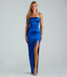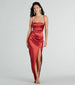 Do your curves a favor when you slip on the elegant Elena formal satin dress! Crafted from luxurious satin fabric. she features classic details like a sleeveless. square neck. spaghetti straps. bust seam detailing. a flattering form-hugging slim silhouette. a high front slit. and a long hem. Complete the look in statement earrings and a clutch for a black tie gala or dinner banquet!