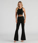 These casual-chic flare pants are perfect for dressing up or down. They feature a high-rise waist with a wrap-around thin strappy design. center-ruched detailing at the front. a form-hugging fit. and a flared-leg silhouette. The ultra soft knit fabric offers plenty of stretch. Style with the matching cropped tank for an effortless look.
