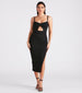 This chic cutout midi dress is elevated perfection! It features a sleeveless subtle sweetheart neckline with a knot detail at the center of the bust. an alluring keyhole cutout under the bust. spaghetti straps. a high waist seam to create a figure-flattering look. a midi-length hem with a thigh-high side slit. and a bodycon silhouette that will hug your curves. The ribbed knit fabric offers plenty of stretch. Style with a pair of strappy stilettos.
