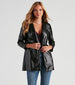 Layer on this elevated sleek faux leather blazer for a city-chic vibe. It features a lapel collar. long cuffed sleeves. front pockets. and a relaxed silhouette. The patent faux leather fabric offers a moderate stretch. Style with hoop earrings and a chain necklace.