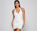 Bring the sparkle to your evening with a formal dress that shimmers under the spotlight! Eloise features a sleeveless. halter v- neckline. sequin geometric pattern. a bodycon silhouette. and a mini-length hem. The dress is composed of a lined mesh fabric with a moderate stretch. Complete look with chrome heels and a rhinestone anklet.