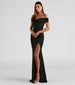 You'll be a breath-taking view in the Emma formal dress at your next black tie affair! She features a sultry. off-the-shoulder neckline with a front bow design. an empire waist seam. and a form-hugging. floor-length hem with a sexy high-cut front slit. The formal dress is composed of a crepe-lined fabric with plenty of stretch. Complete your dressy look with a radiate necklace and earrings set.
