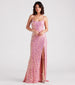 Unveil an enchanting look for homecoming or a formal soiree in the Emmeline iridescent sequin dress! She features a sleeveless square neckline with a built-in padded bust. dual bungee spaghetti straps. an open back with a strappy cross-back design. and a fitted high waist. Her floor-sweeping hem has a high front slit. a subtle train. and a flowy A-line silhouette. Her all-over sequin embroidery has a gorgeous iridescent hue. The lined mesh fabric offers a moderate stretch. Complete your princess look with rhinestone heels.