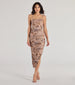 Create an enchantingly chic party look in this lined mesh midi dress accented with a soft floral print and shimmering foiled outline. It features a sleeveless square neckline. spaghetti straps. ruched seams to accentuate your curves. and a midi-length bodycon silhouette detailed with a high-cut side slit.