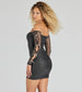 This glitter mesh mini dress gives endless shine vibes! The mini dress features stunning long sleeves. rhinestone embellished bows. and keyhole accents while the bodycon silhouette flaunts your figure. Pair this dress with a clutch.