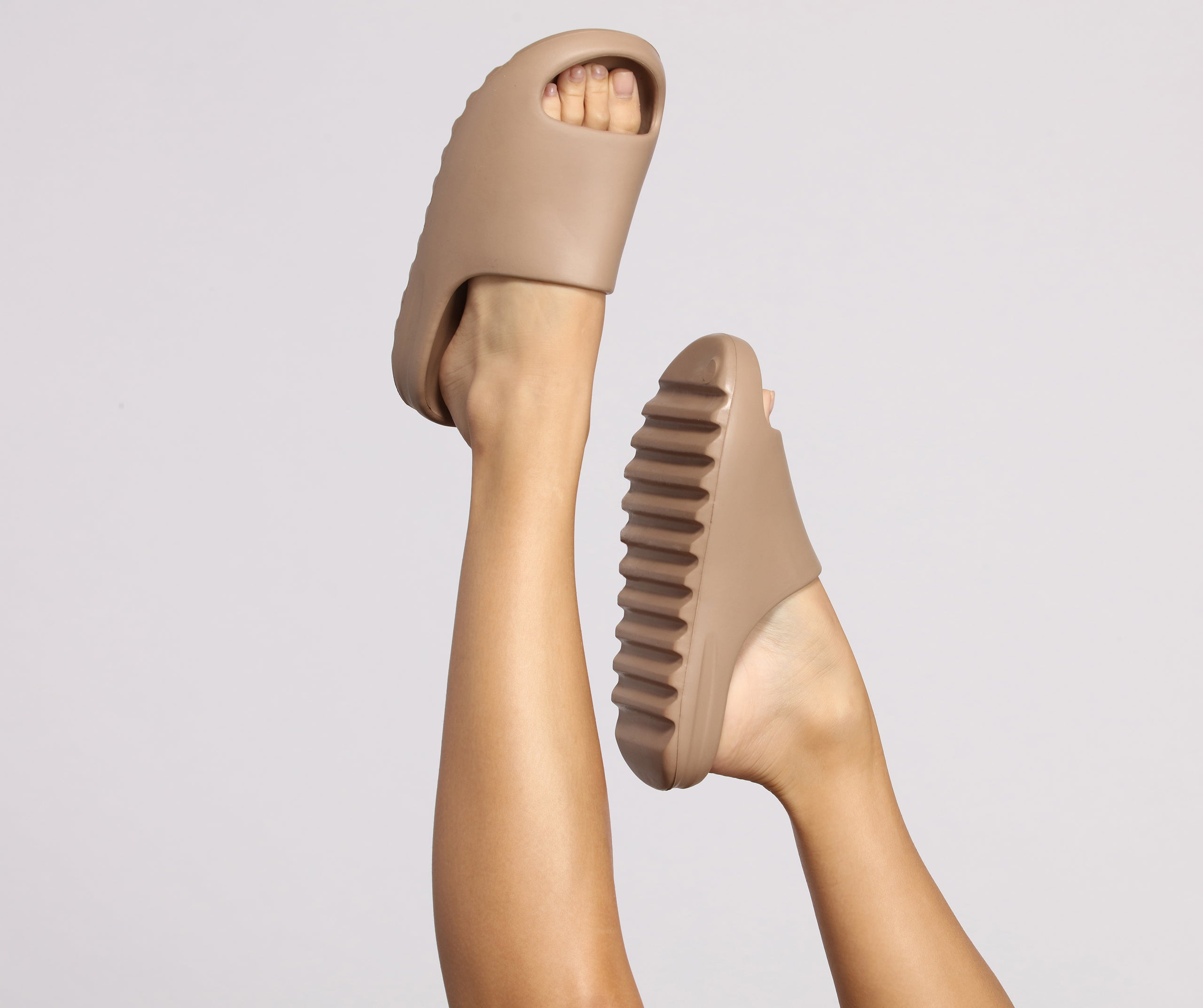 These basic slides are perfect for lounging in with. The slides feature an easy-slip on design. a wide strap. and a textured lug sole. Complete look with a matching set.