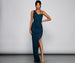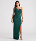 Bring the glitz and glamour in a formal dress that reflects elegance! The Ever formal long dress features a sleeveless asymmetrical cowl neckline. a ruched shoulder strap. a spaghetti strap. and a high side slit to show off plenty of leg. Ever is composed of luxe glitter knit fabric that offers a form hugging fit with a moderate stretch. Complete look with rhinestone heels.Â