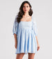 You'll be a darling delight in this short skater dress perfect for parties and ceremonies! It features three-quarter-length puff sleeves. a square neck. a smocked back. and a fit and flare silhouette. The dress is composed of a floral burnout woven fabric with a chiffon lining and no stretch. Style with earrings and a choker to complete the look!