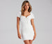 Keep your eye on this prize! Bring the flirty allure in this eyelet lace mini dress featuring short puff sleeves. a ruffle sweetheart neck with tie. and a babydoll-style bodice on a form-fitting silhouette. Complete the look in lace-up sandals for a cute picnic look.