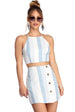 Stun them all in trendy stripes! This cute crop top feature a combination white with light blue hue. a halter neck with racer bust and an open back with tie back accent. Top is composed of a lined lightweight woven fabric that offers a form hugging fit with a minimal stretch. Be sure to pick up the matching skirt to complete your look!