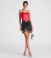 The obsession is real! You'll fangirl all over this satin mini skirt featuring a sleek high-rise waist. a bodycon silhouette. and an asymmetrical wrap hem with chrome fringe trim. The skirt is composed of smooth satin fabric with some stretch. Complete the look in a chic corset top for a birthday party!