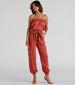 Stand in command as the fashion cadet! This cargo jumpsuit features a sleeveless. strapless elasticized neckline and waist. belted tie-front detail. side hip and flap pockets. relaxed fit. and elasticized cuffs. Complete the look in cute boots.