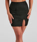 Keep it chic with this trendy faux suede mini skirt. It features a high-rise waist. flattering vertical front seams. and a slit accent. The skirt offers a form-hugging fit that enhances curves and a moderate stretch. Complete the look in a flirty top and heels for a day or night occasion.