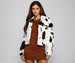 Stay on trend this season with a jacket that is perf for those layered looks! The jacket features a cow print. a collared neckline. long sleeves with snap button closure at cuff. multi-snap button front closure. two chest faux pockets. and a cropped hem. The jacket is composed of a lined faux fur fabric that offers a relaxed fit with minimal stretch. Complete look with a bodysuit and distressed jeans.