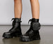 Lace-up in these chic booties that bring part glam. part edge. The boots feature a mid-calf fit. a lace-up front. an inner zipper closure. an almond toe. a lug sole. and an adjustable band with an attached pocket. Complete look with a graphic tee and cutoff shorts.