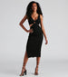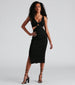 Sizzle and stun in this midi dress perf to bring up the temps! It features a sleeveless plunge V-neckline with a center O-ring insert. cutout bodice. form-fitting silhouette. and a side slit accent. Complete the look in lucite mules for a night out.