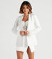 Layer on this chic woven blazer for a fancy and fab 'fit! It features a lapel collar. long sleeves with on-trend marabou feather trims. a single-breasted design. and a fitted silhouette. The smooth woven fabric includes a lightweight lining. Style with a corset top and faux leather shorts.