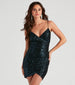 Shake things up in the Felicity sequin party dress to make your sparkling entrance at a birthday celebration or girl's night! She features a sleeveless v-neckline. sleek bungee spaghetti straps. and a wrap bodice with side pleating to give the illusion of an hourglass figure along her bodycon mini-length silhouette. The formal party dress is composed of a sequin fabric with a knit lining and minimal stretch. Complete your striking look in silver heels.