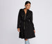Add a feminine flare to your outerwear! This long line trench coat has a mock neckline with a button closure. shoulder button detailing. and breast lapels with button detailing as well. This trench includes pockets. and a belt around the waist. it flares out into a skirt style hem that adds a flirty flare! Jacket is composed of a crepe material that offers a moderate stretch.