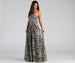 Get swept up in a formal dress that brings the elegance to prom! Filippa features a sleeveless square neckline. supportive padded cups. and removable adjustable spaghetti straps. She features a metallic embroidered baroque pattern throughout that creates a regal vibe. Her slim-fit bodice leads to an enchanting A-line silhouette. She is composed of a lined mesh fabric that offers a flowy fit with minimal stretch. Complete outfit with rhinestone heels and a tennis bracelet.
