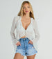 Look further for outfit inspiration than this chiffon top perfect for adding a high fashion look! With its charming long sleeves with flared cuffs and ruffled trim V-neckline. this top exudes elegance and style. The tie-front detail adds a playful touch. while the sheer chiffon fabric keeps you feeling light and airy. Complete the look with a bralette and jeans!