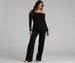 Look like first class in this crepe jumpsuit as you jet off to your next destination! It features a chic fold-over neckline. off-the-shoulder long sleeves. a fitted bodice. and a wide-leg silhouette with a back zipper closure. Complete the look with a trendy tote bag.