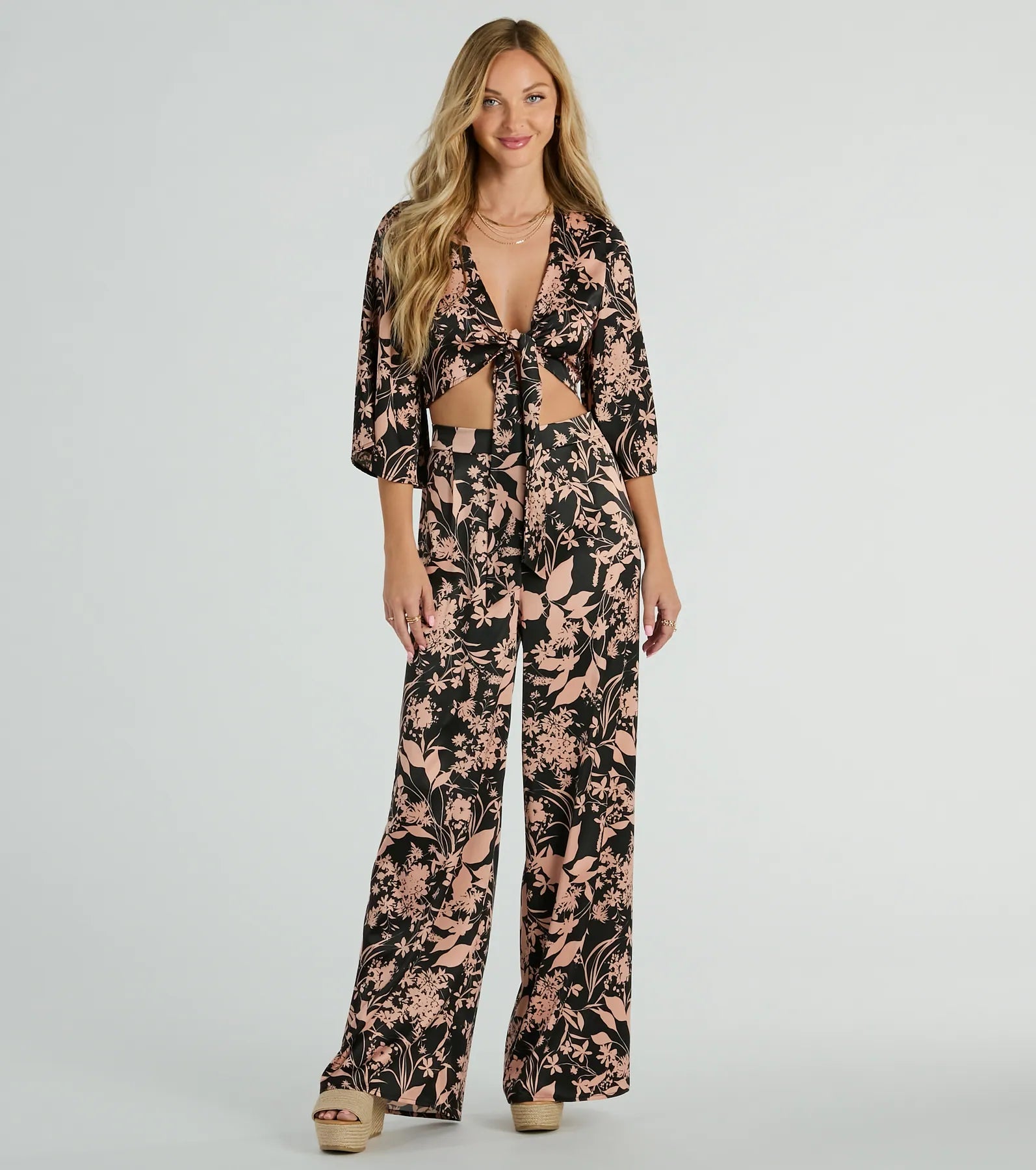 You can't go wrong stepping out in this floral satin pants on a getaway or having a sunset dinner! Show off your fashion sense with these pants with a flattering high-rise waist. wide-leg detail. and a dainty floral print. Complete the look with the matching top.