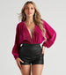 Flawless and sultry! Bring the allure in this surplice bodysuit featuring long balloon sleeves. a plunge V-neckline. and a faux wrap bodice. cheeky bottom with dual snap-button closures on pleated knit fabric. Complete the look in hot shorts and mules.
