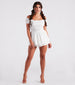 Style up this flirty ruffled knit romper for your summer weekend plans! It features an off-the-shoulder neckline with a dainty ruffled trim. short puff sleeves. ruching at the bust. a stretchy smocked waist. and an adorable tiered ruffled design with a short skirt layered over flowy shorts. Complete the look with beaded earrings.