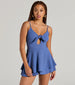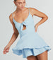 This adorable tie-front ruffled romper will create a flirty look for your weekend plans! Designed with a lightweight woven fabric. it features a sleeveless V-neckline with a tie-front design and a keyhole cutout under the bust. spaghetti straps. dual high waist seams. flowy shorts with a mini-length overlay. and a cute fit and flare silhouette. Style with clear heels for brunch.