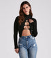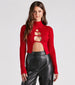 This is one flirty secret you won't be able to keep! Slay every outfit this season in this mock neck sweater top featuring long sleeves and an open front with knot-tie strap detailing and a cropped hem. Complete the look in high-rise denim jeans for your daytime plans.