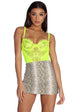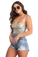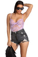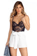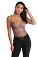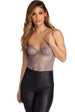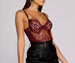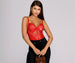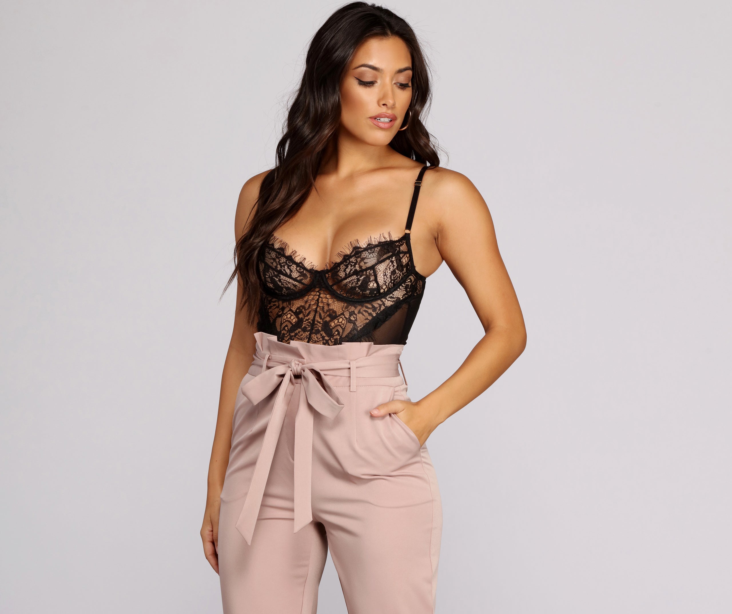 Casually remind your bae just how lucky they are when you wear this sexy. bodysuit! It features a V neckline with eyelash lace trim. bust underwire for support. adjustable spaghetti straps. a scoop back and a thong bottom with a double hook closure. Bodysuit is composed of completely sheer lace and mesh that offers a form hugging fit with moderate stretch.