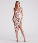 You'll look pretty as a picture in this floral satin midi dress for all of your springtime frolics! It features a sleeveless v-neck. adjustable spaghetti straps a cowl pleated neck overlay. and a form-hugging silhouette with a sultry side slit. Style with a chic handbag for a date or wedding shower!
