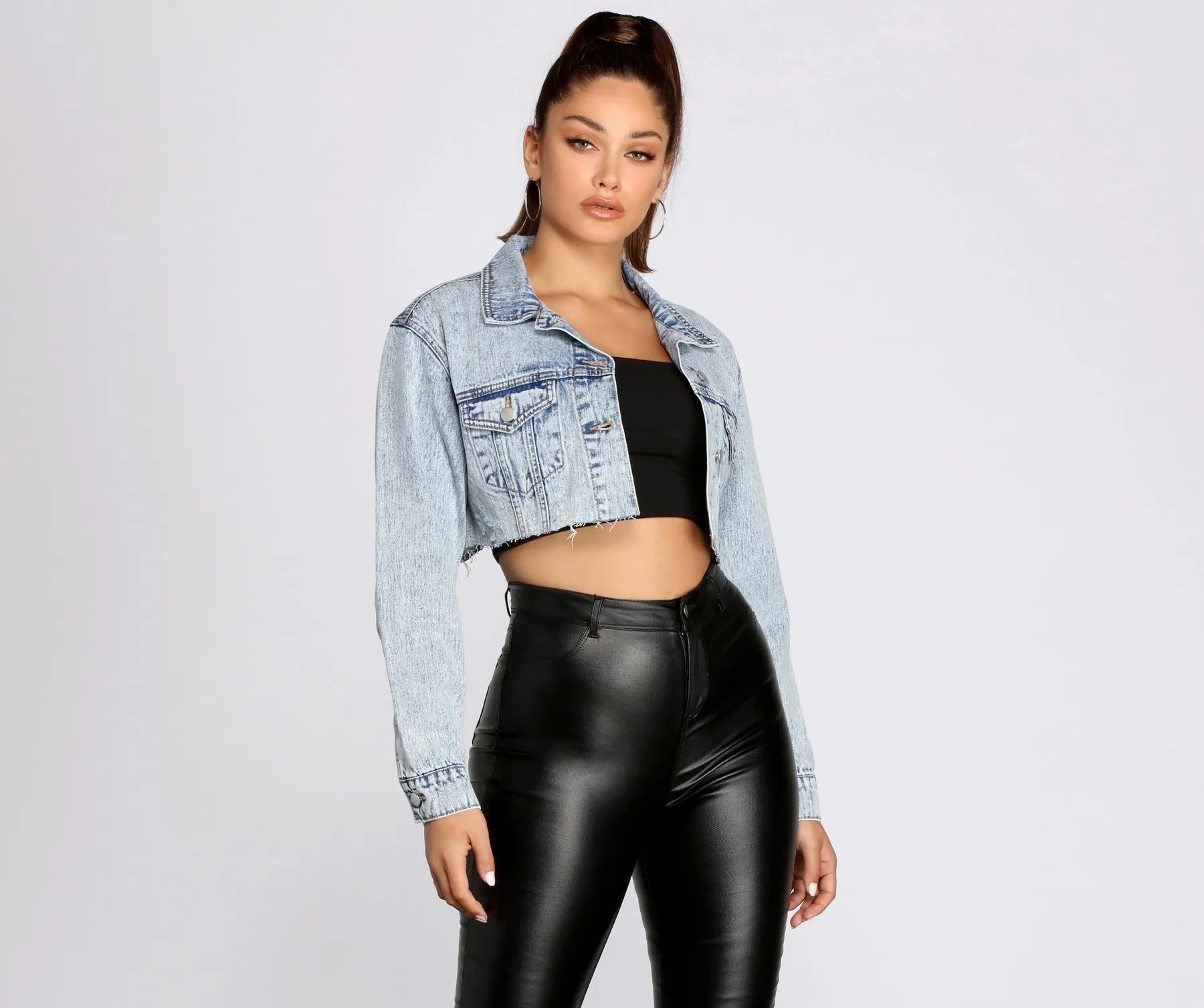 The styling possibilities will be endless with this trendy denim jacket! It features a collared neckline. long sleeves with button cuffs. a complete button-down front. dual chest pockets. a cropped relaxed fit with a raw edge frayed hem. and is composed of an acid wash denim fabric with destructed detailing. Pair it over a basic crop top with faux leather pants to add some flair.