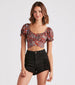 Calling all free-spirited babes! This crop top is perfect for festivals and your warm-weather closet. It features adorable puff short sleeves. a scoop neck. and a flirty tie-back on woven fabric with a boho paisley-floral print. Complete the look in trendy denim shorts.