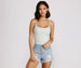 Keep it flirty in a frilly cami tank. This must-have cropped cami tank features a scoop neckline. spaghetti straps. and a frilly lettuce-edge hem. Complete your look with the matching jacket to layer with and a pair of high waist jeans.