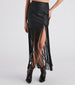Only fun times are to be had in this faux leather skirt at festivals. concerts. or a bachelorette weekend away! It features a sleek high-rise waist. bodycon silhouette. and cascading long fringe trim. Complete the look in western-style booties.