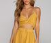 It's all about the vacay vibes in this sultry striped mustard crop. Top features adjustable spaghetti straps. a V neckline. twist wrap detail at front. and tie straps at back. Top is made from a midweight. linen-like material with little to no stretch. Be sure and check out the matching skirt to round out your look!