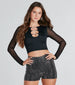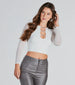The details on this crop top are worth sharing! Boasting a sheer mesh long sleeve. crew neck. sleek chain cutouts. and a cropped hem. this smooth knit top will take your look to the next level. Complete the look in rhinestone denim jeans for extra bling!