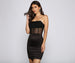 Head out with the squad in a mini dress that is perf for a memorable GNO! The dress features a sleeveless square neckline. a partially sheer bodice. piping accents. and a mini-length silhouette. The dress is composed of a contrast satin and mesh fabric that offers a form-hugging fit with minimal stretch. Complete look with stilettos and a clutch.