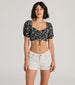 Channel a cute girlycore vibe with this floral puff sleeve crop top! Detailed with a dainty floral print. this top features a sweetheart neckline. a ruched bust with an adjustable drawstring. adorable short puff sleeves. a smocked back for added stretch. and a cropped hem with a flirty ruffled trim. Style with high-rise jeans and sandals.