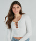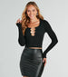 You'll obsess over the glam deets of this rhinestone trim cutout crop top! It features a scoop neckline. front bust cutouts creating a plunging design with chic rhinestone bar trims. long fitted sleeves. and a fitted cropped hem. The ribbed knit fabric offers plenty of stretch. Style this fab top with a mini skirt and heels for a night out.