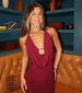 Turn up the glam factor on your night out in this glitzy mini dress made with glimmering glitter knit fabric. It features a sultry plunging draped cowl neckline with a bar strap detail. tie-back halter straps. a bold open back accented with a single bar strap. and a short bodycon silhouette to hug your stunning curves.