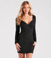 A glitter mini dress to inspire your glam girl era! The short dress features a V-neckline with a surplice design. long fitted sleeves. a mini-length hem. and a bodycon silhouette that will hug your curves. this dress is a dream! The glitter knit fabric offers a moderate stretch. Style this mini glitter dress with clear heels.