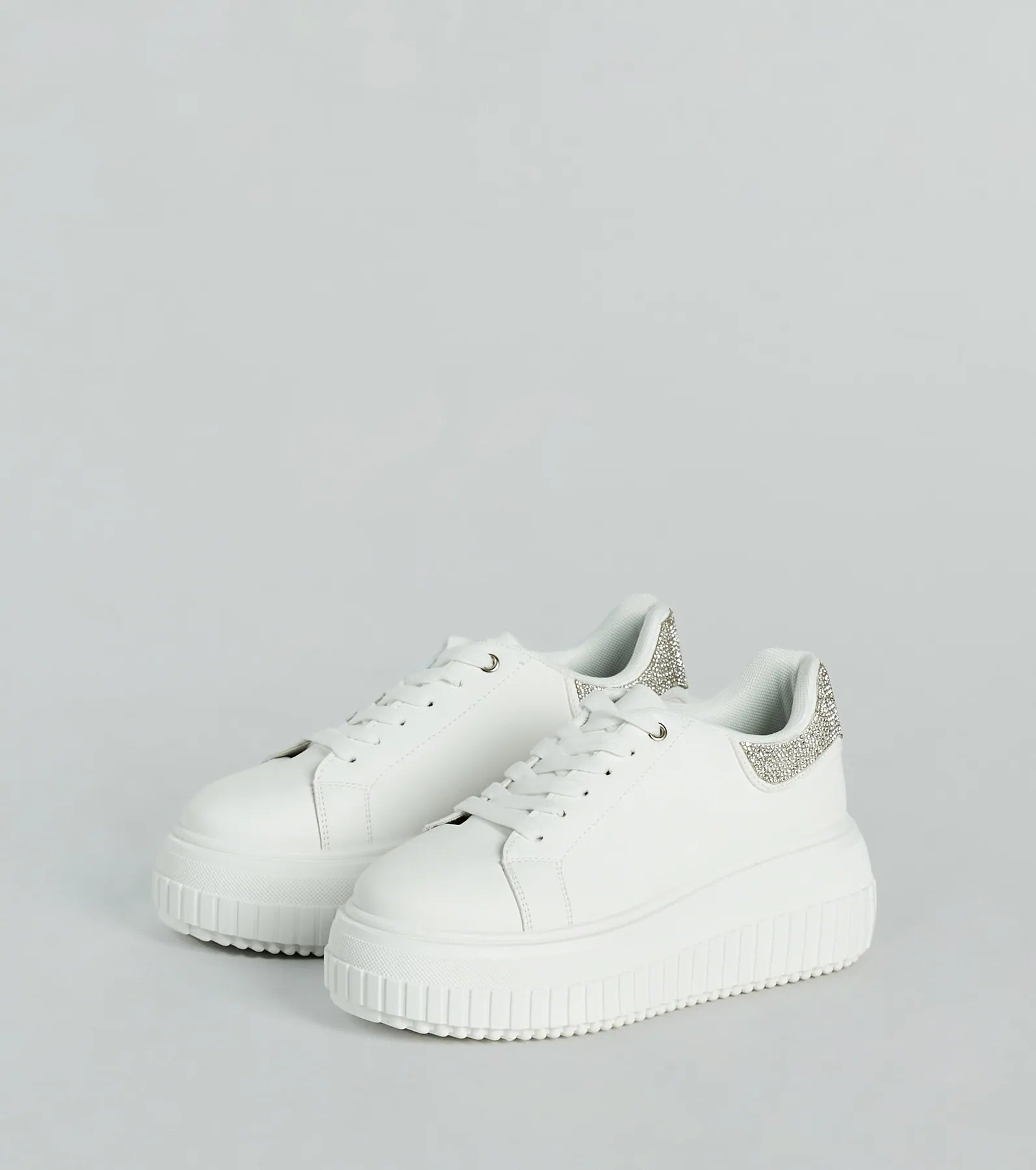 Get your glam girl sparkle on in these faux leather rhinestone sneakers! Featuring a round toe and lace-up placket. these sneakers are both stylish and comfortable. The chunky platform sole adds height and the rhinestone embellished heel trim adds a touch of sparkle. Complete the look with a trendy denim jacket.