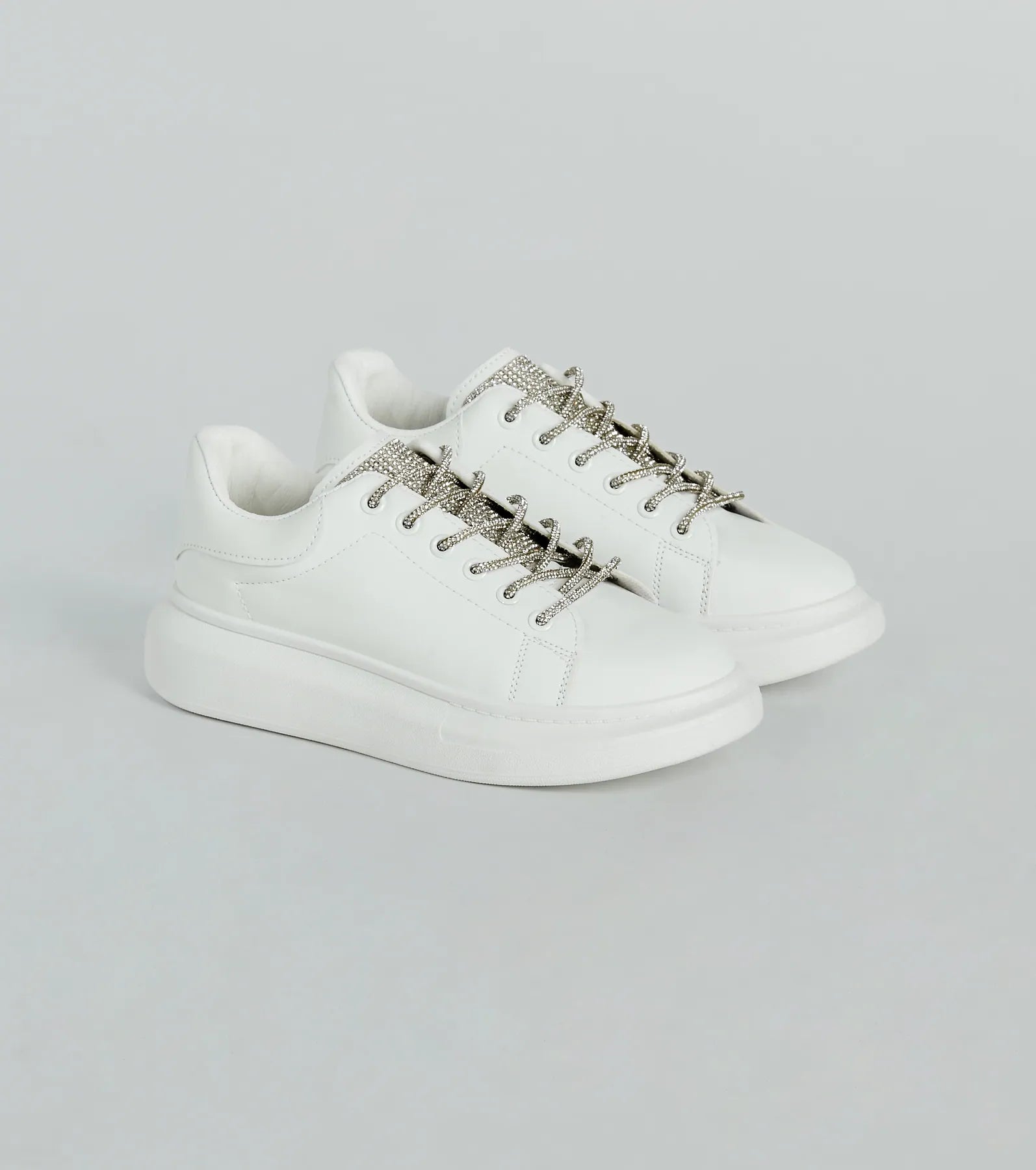Make any outfit shine in these fashion sneakers! With a round toe. rhinestone embellished lace-up placket and tongue. a platform rubber sole. and a sleek faux leather upper. these sneakers are perfect for stepping out with your glam squad. Complete the look in a smooth knit dress to elevate your style for day or night plans!
